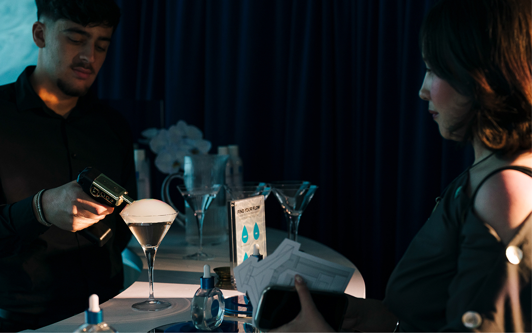The experience culminated at the Water Bar, where guests were treated to custom drinks and the spectacle of a roaming ice sculpture pouring champagne (Moet of course!), before closing with a water-activated Future Pledge card revealing a hidden message of renewal.